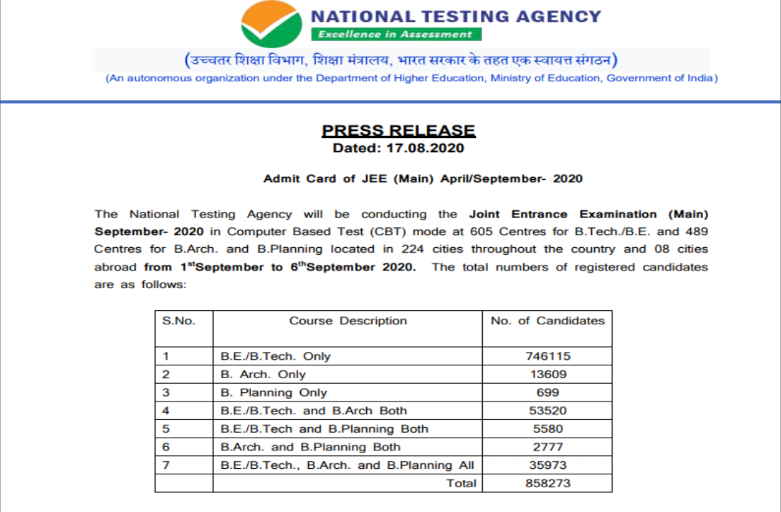 Jee main 2020 admit card will be released by the national testing agency (nta).